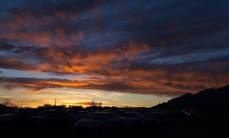 2026 March Sunset and Cars in the Sabino Canyon Parking Area. Charles Miles. 3/27/2026.